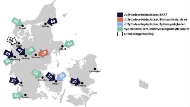 Rettet 20. janyar: Rubrikken ændret fra 275 til 200. Tallet 275 kommer, hvis man regner de udflyttede arbejdspladser i Skatteankestyrelsen og Spillemyndigheden med, som de fremgår af illustrationen. dknyt beklager.